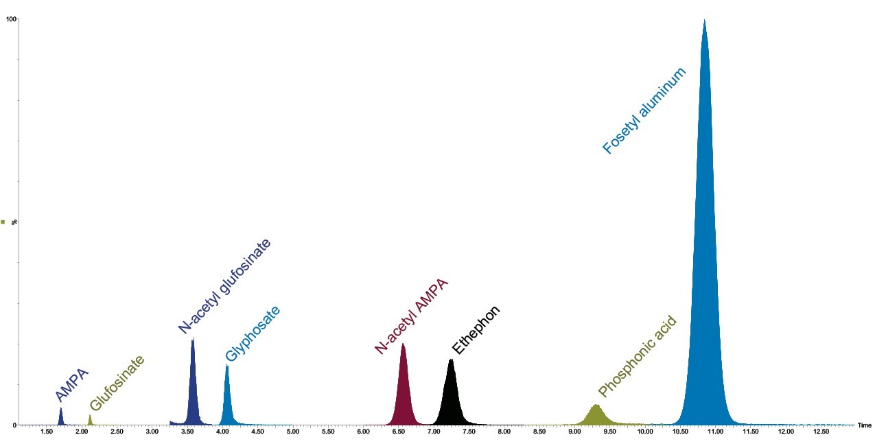 8 loại thuốc trừ sâu (AMPA, glyphosate, n-acetyl glufosinate, glufosinate, n-acetyl AMPA, ethephon, fosetyl aluminum và acid photphonic) được phân tích trong các thực phẩm khác nhau bằng cách sử dụng chế độ điện cực ion âm . Tất cả các mẫu thực phẩm được chiết xuất theo phương pháp QuPPe.