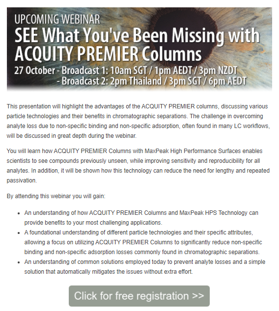 Giới thiệu nổi bật những ưu điểm của cột ACQUITY PREMIER, thảo luận về các công nghệ hạt khác nhau và lợi ích của chúng trong phân tách sắc ký. Khó khăn trong việc giảm thiểu sự hao hụt chất phân tích do liên kết và hấp phụ thứ cấp, thường thấy trong nhiều quy trình làm việc LC, sẽ được thảo luận sâu trong webinar